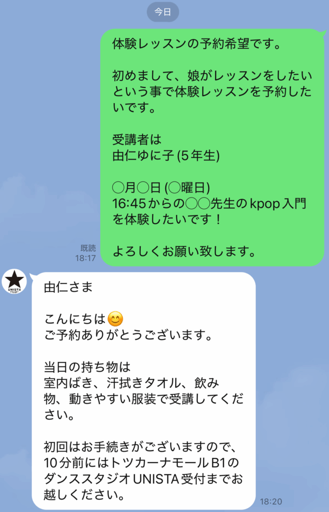 ① お名前(受講者) / ② 学生の場合は学年 or 一般 / ③ 希望の日時(クラス名)を記載していただき送信してください。